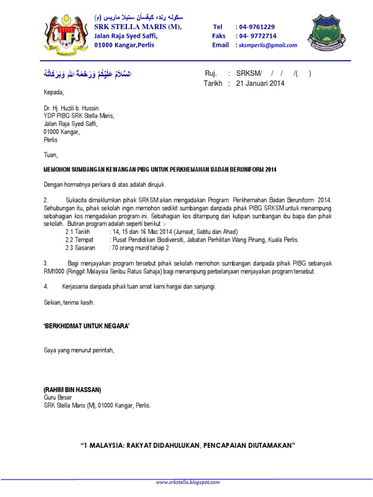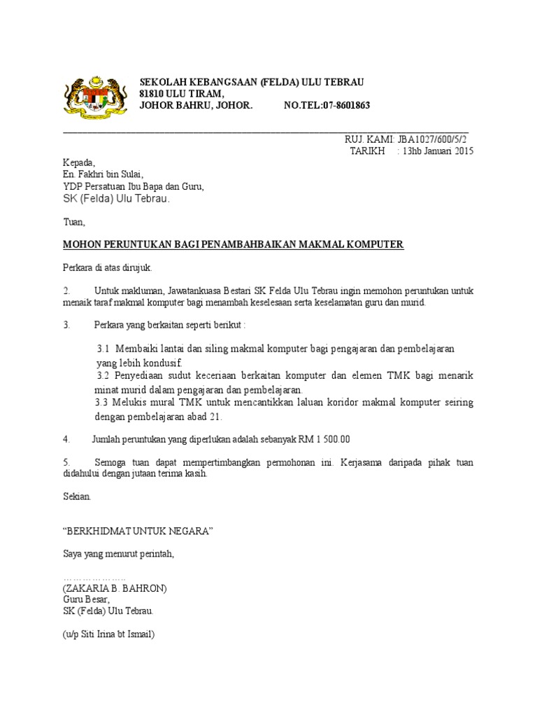 Contoh surat rasmi memohon sumbangan kewangan surat rasmi. Letterhead pibg ruj kami smktpg pibg 2014 1. Galeri contoh surat rasmi permohonan bantuan terbaik 2019.