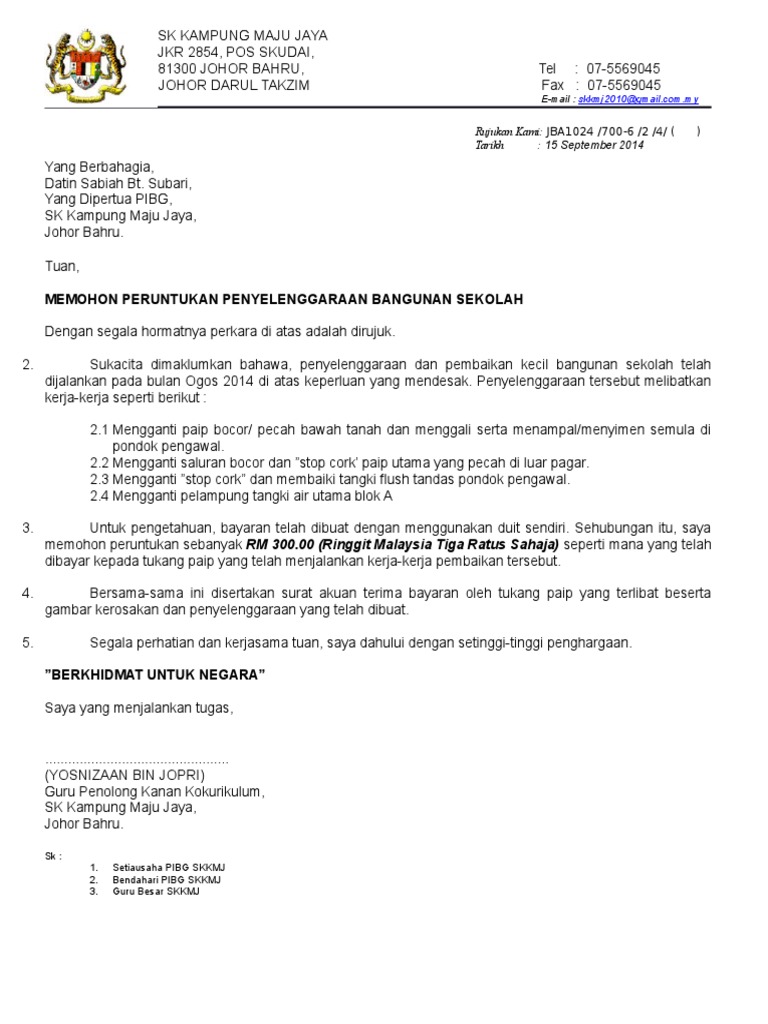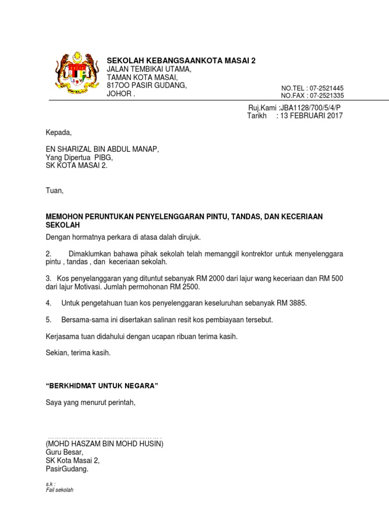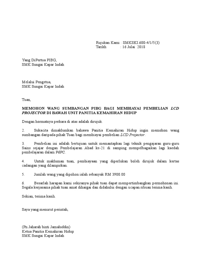 Letterhead pibg ruj kami smktpg pibg 2014 1. Oleh sebab itu kelab guru kakitangan smkr gukat ingin memohon bantuan kewangan. Contoh surat rasmi memohon sumbangan kewangan surat rasmi mohon peruntukan dan sumbangan pada 1 4 2016 jumlah.